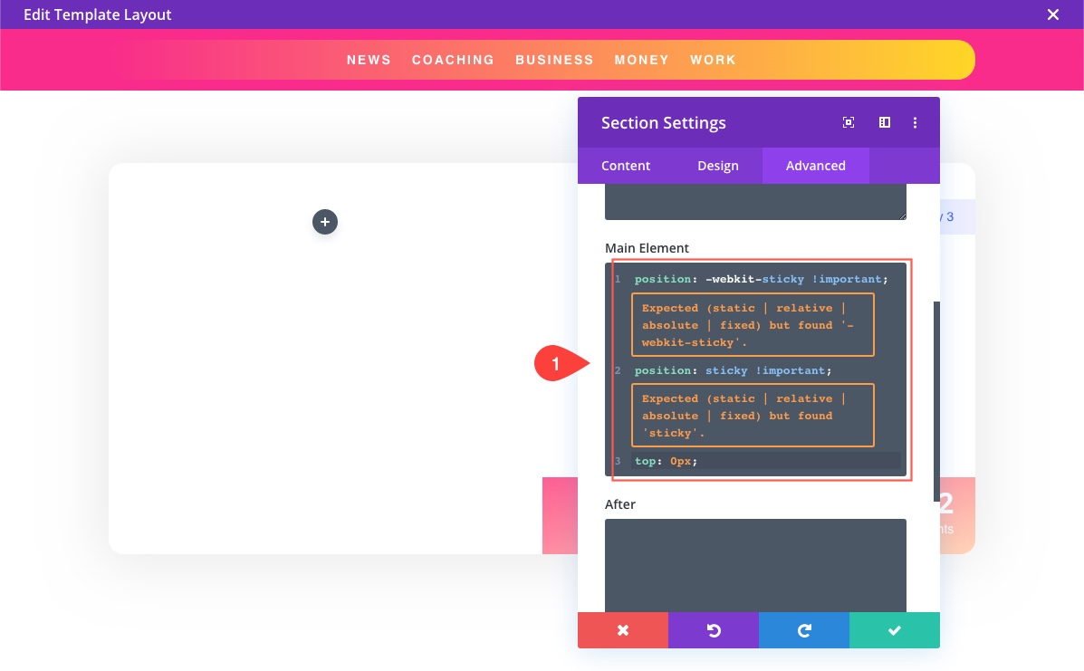 这当然是可选的,但要创建粘性类别菜单,请打开部分设置并将以下自定义 CSS 添加到主元素: