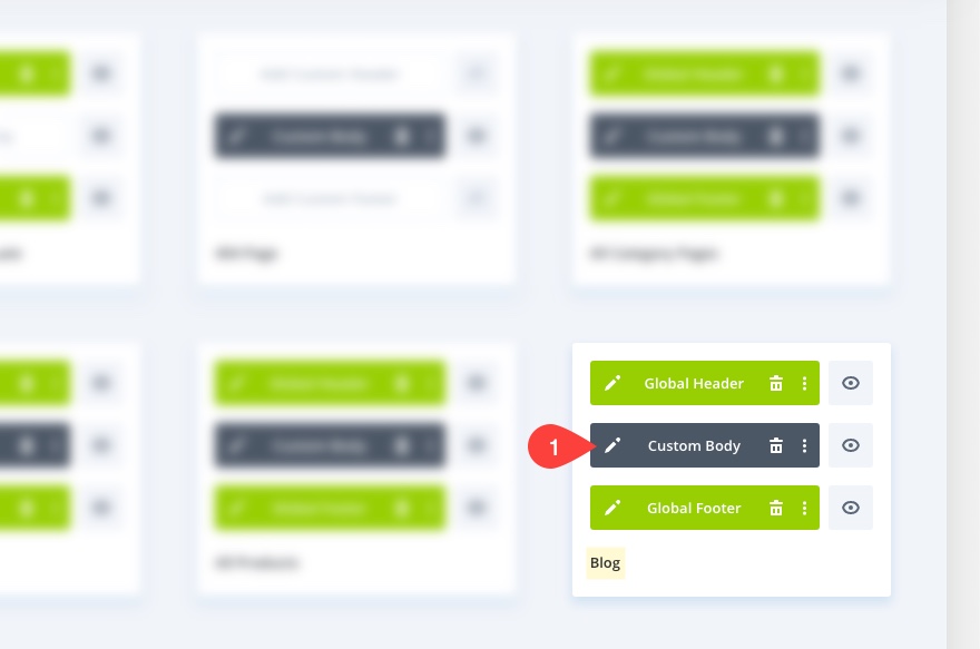 在主题生成器界面中,找到已分配给“所有帖子”的模板,然后单击自定义正文区域上的编辑图标。