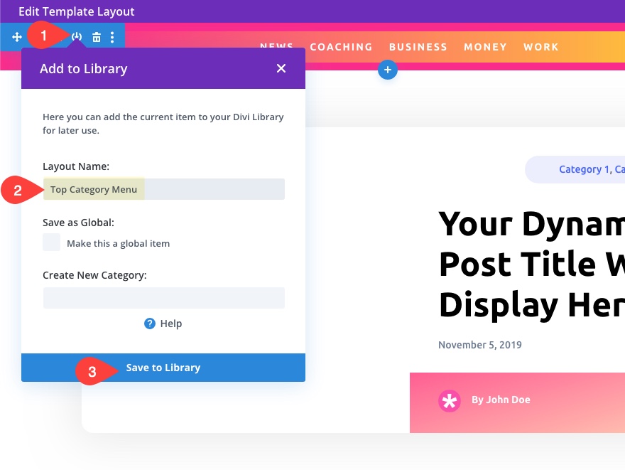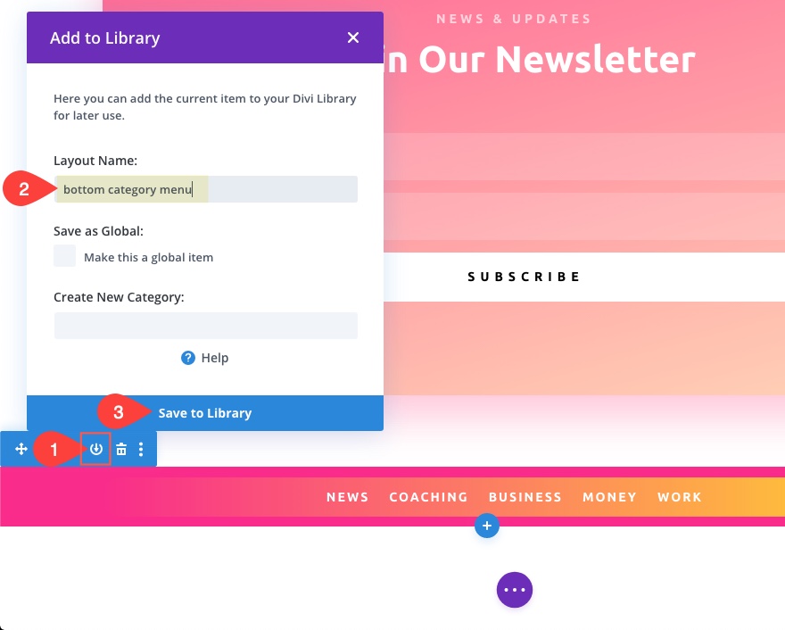 我们已完成为布局创建两个类别菜单。 为了便于将它们添加到其他模板,我们可以将它们保存到我们的 Divi 库中。 要保存顶部菜单,请从部分菜单中选择“添加到库”图标。 然后为布局命名并单击“保存到库”按钮。