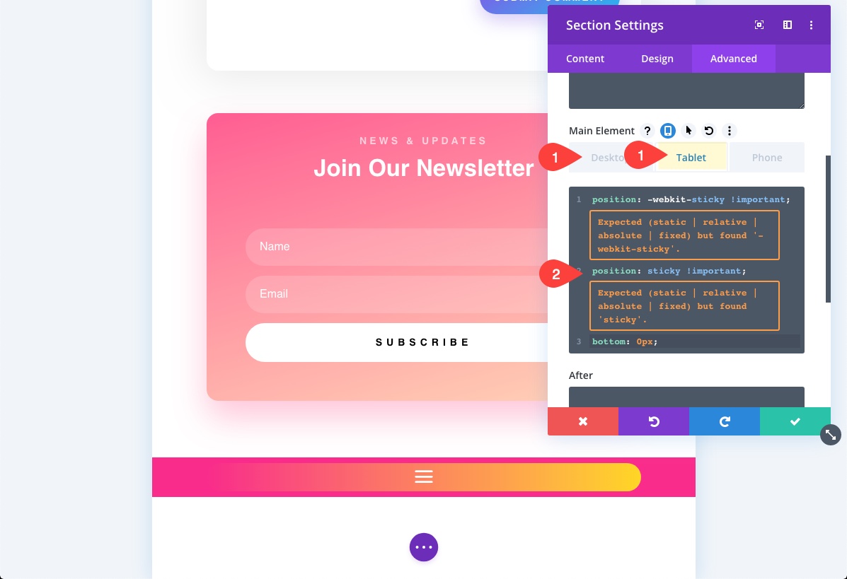由于我们只需要这个菜单“粘”在移动设备上,打开部分设置并删除桌面的自定义 CSS。 然后在平板电脑选项卡下添加以下自定义 CSS。