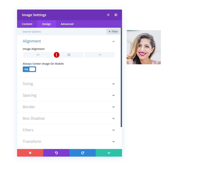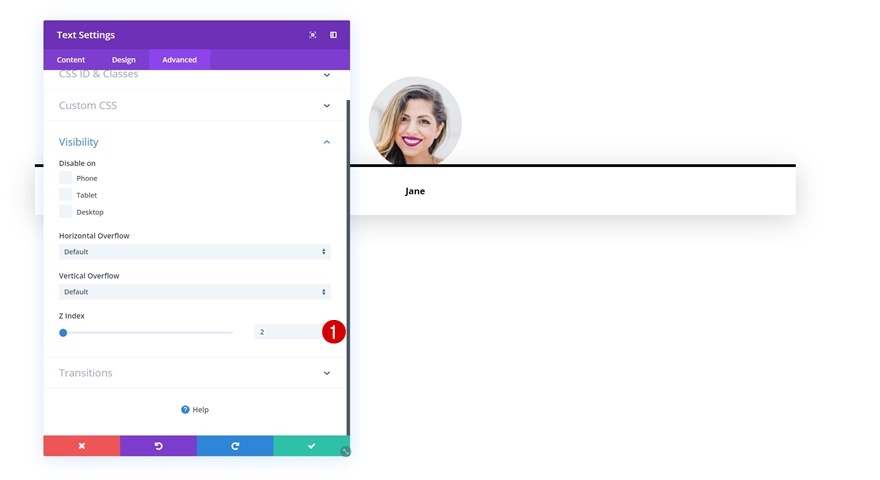 为了确保文本模块保持在图像模块的顶部,我们将在文本模块的可见性设置中增加 Z 索引。