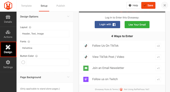 当您对赠品的设置方式感到满意时,是时候通过单击“设计”选项卡来更改它的外观了。