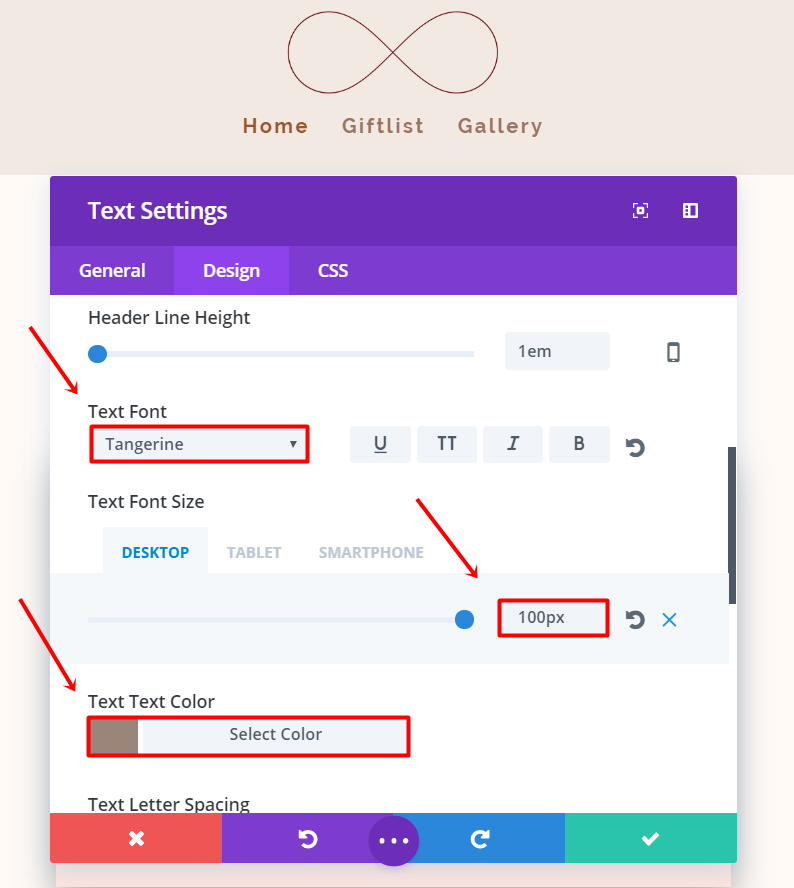 然后转到高级设计设置,将文本字体设置为“橘色”,将文本字体大小设置为“100px”(桌面和平板电脑)和“68%”(手机),将文本字体颜色设置为“#9b857b”。 向下滚动相同的选项卡并将边距更改为“10%”顶部和“5%”底部。