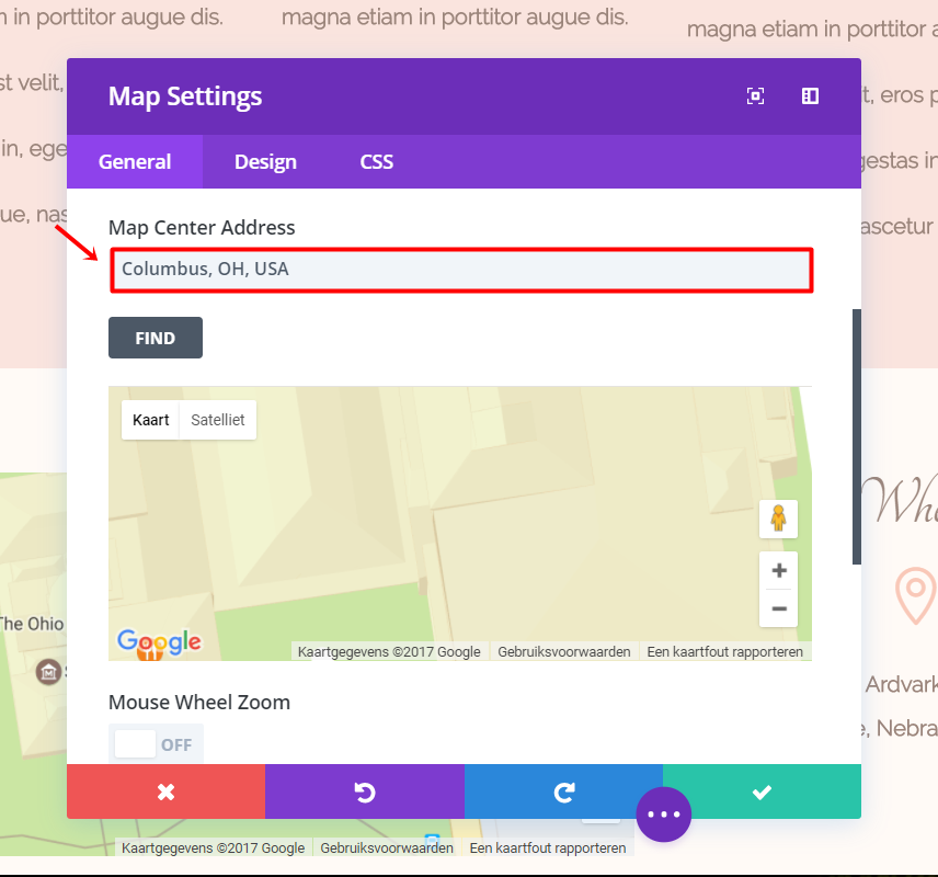 在本节的第一列中,添加一个 Map 模块。 为了能够使用地图功能,您必须输入一个 Google API 密钥。 如果您没有 API 密钥,请在此处阅读如何制作一个。 输入您的婚礼地址,让模块找到位置。 要在您的地图上创建图钉,请添加新图钉并再次放置该位置,图钉将显示在地图上。