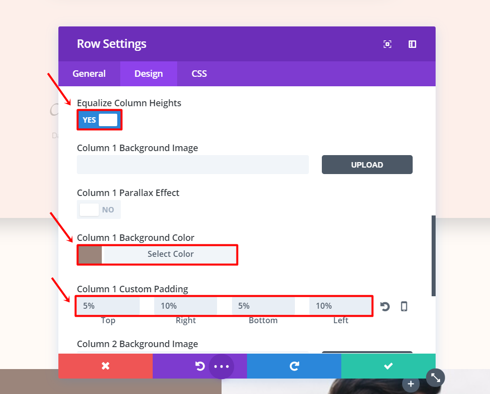 接下来,转到“设计”选项卡并上传两列的背景图像,并对两列的自定义填充进行以下更改: