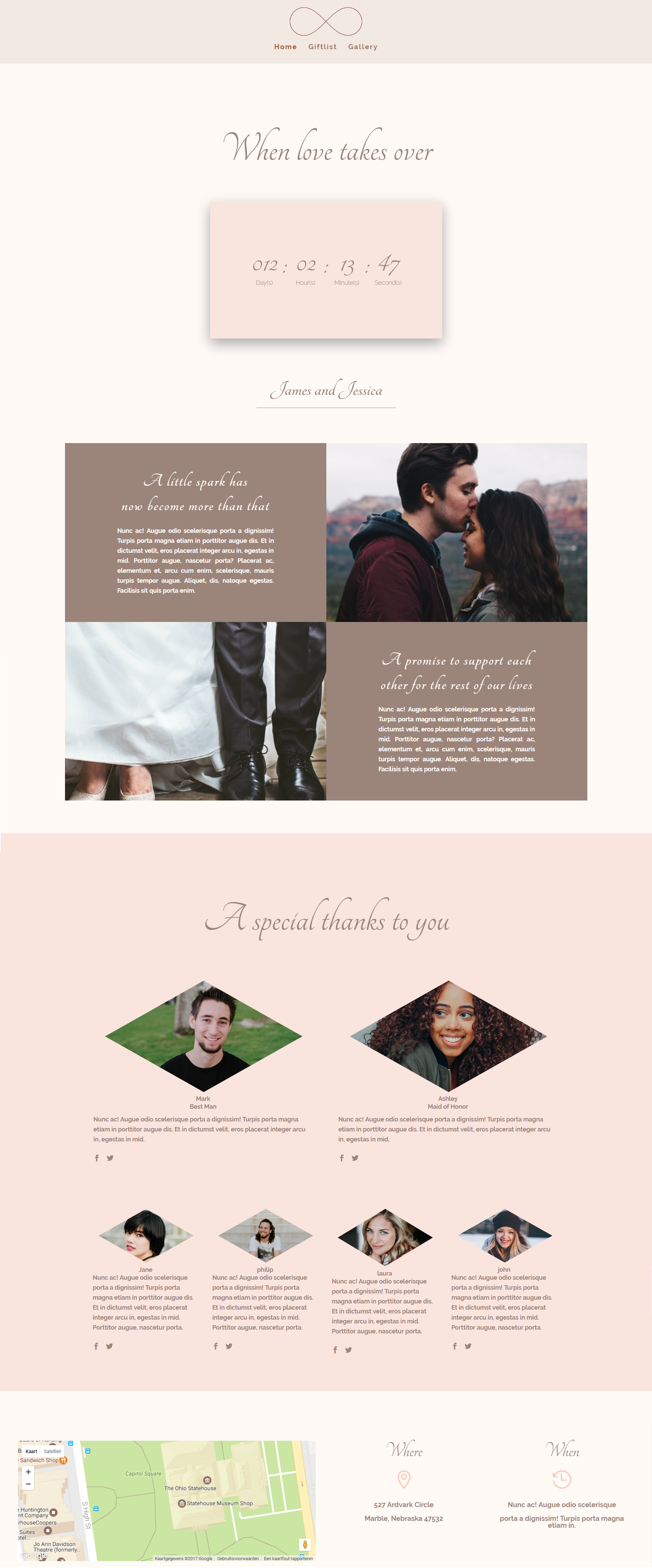 该网站有四个部分,每个部分都为网站贡献其价值——使您的婚礼公告完整。 我们将详细解释每个部分,并向您展示如何创建与上述布局相同的设计。
