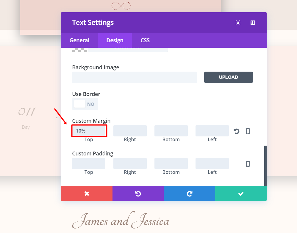 继续在高级设计设置选项卡中滚动到自定义边距并将“10%”添加到顶部边距。