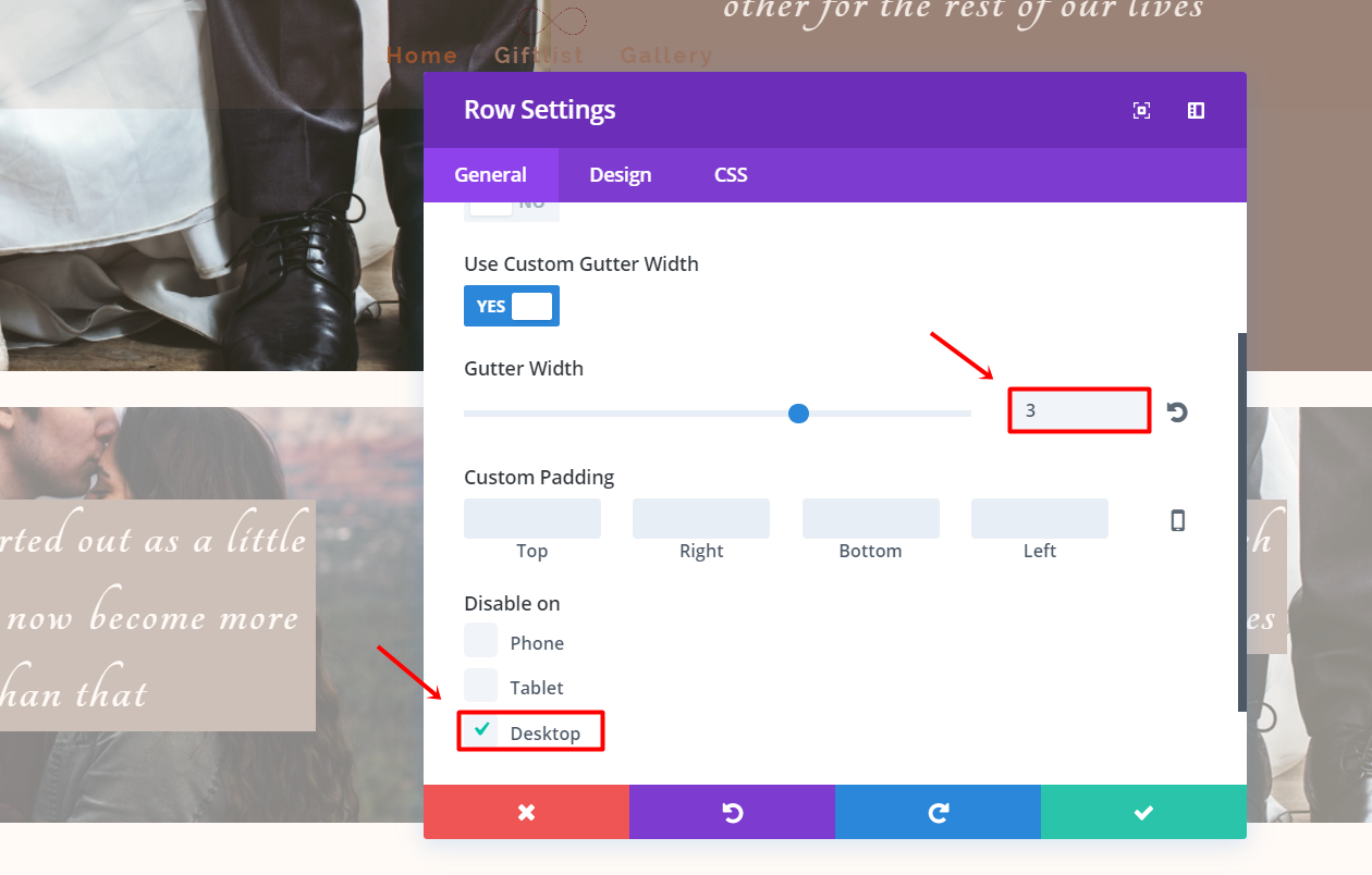 创建另一个两列行并隐藏桌面。 使行全宽并将装订线宽度更改为“3”。