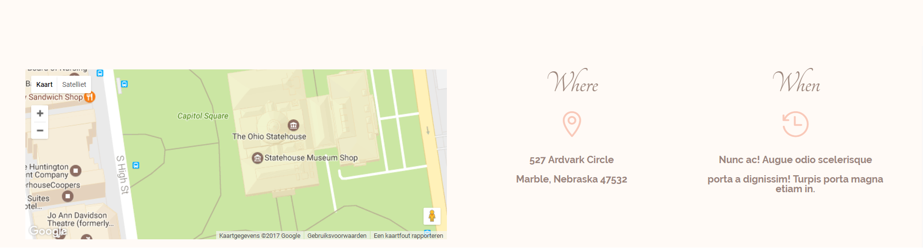 这是您婚礼主页的最后一部分,您将在此向观众介绍婚礼的地点和时间。 对于本节,我们需要一行 3 列(1/2、1/4、1/4),背景颜色如下:“#fffaf6”。
