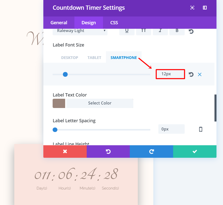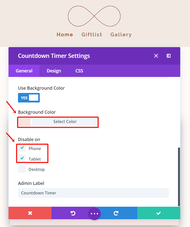 在您刚刚创建的文本模块下方添加一个倒计时模块。 在“常规设置”选项卡中,添加婚礼的日期和时间并将背景颜色更改为“#fae4de”。 我们将仅在台式机上使用此倒计时,请继续为平板电脑和手机禁用它。