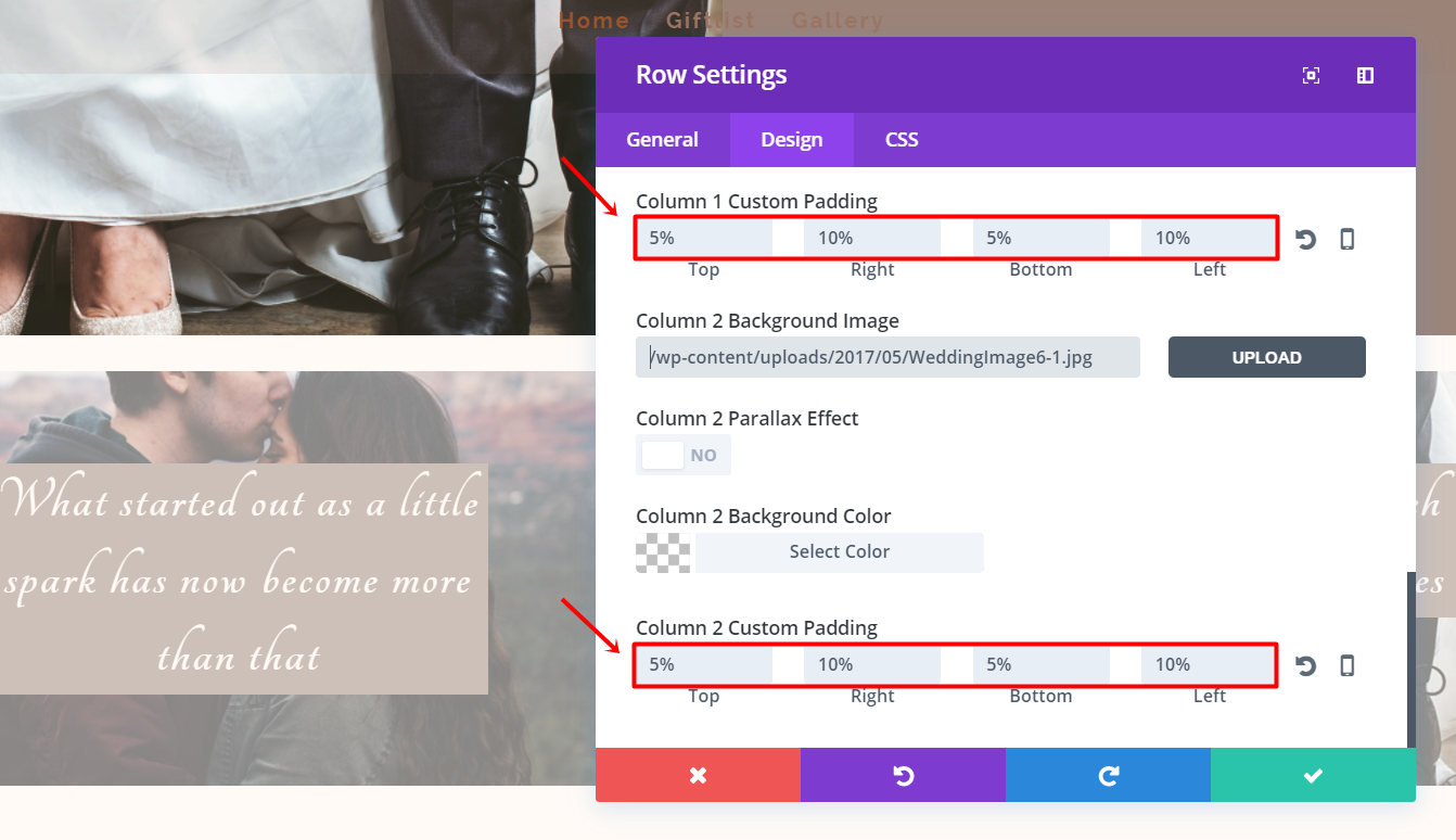 然后,打开行设置并将背景图像添加到第一列。 删除我们在第一列填充中所做的所有填充设置,并将它们放在第二列填充中。