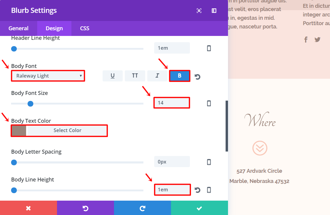 在其他专栏中,我们将使用文本模块和简介。 添加文本模块并将常规设置中的文本方向设置为“居中”。 接下来,转到高级设计设置并进行以下更改: