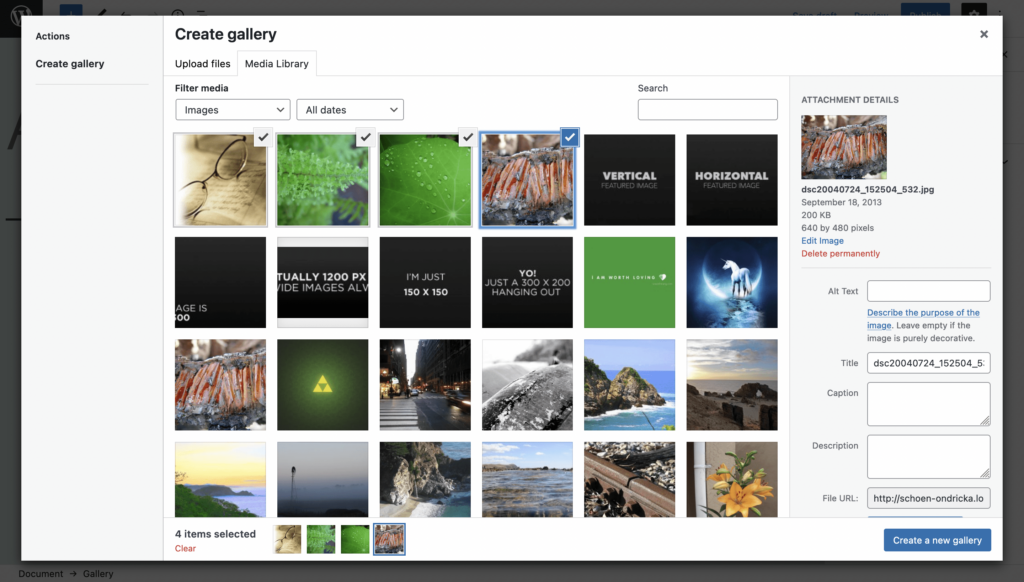 在 WordPress 中拥有图像后,您需要使用文本字段为您的画廊命名,然后单击创建并选择以构建您的新画廊。 作为替代方案,如果您想从媒体库上传,您将首先创建您的画廊,然后从熟悉的界面中选择您的图像。