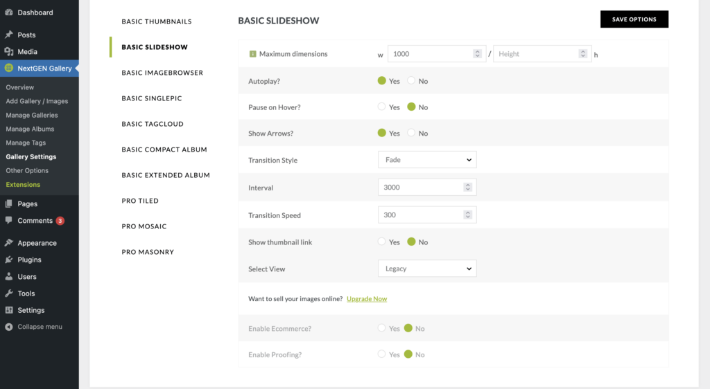 在这里,您可以更改许多不同的选项,以确保您选择的画廊满足您的需求。 使用幻灯片画廊样式,您可以选择设置特定尺寸、自动播放幻灯片、设置过渡样式等等:
