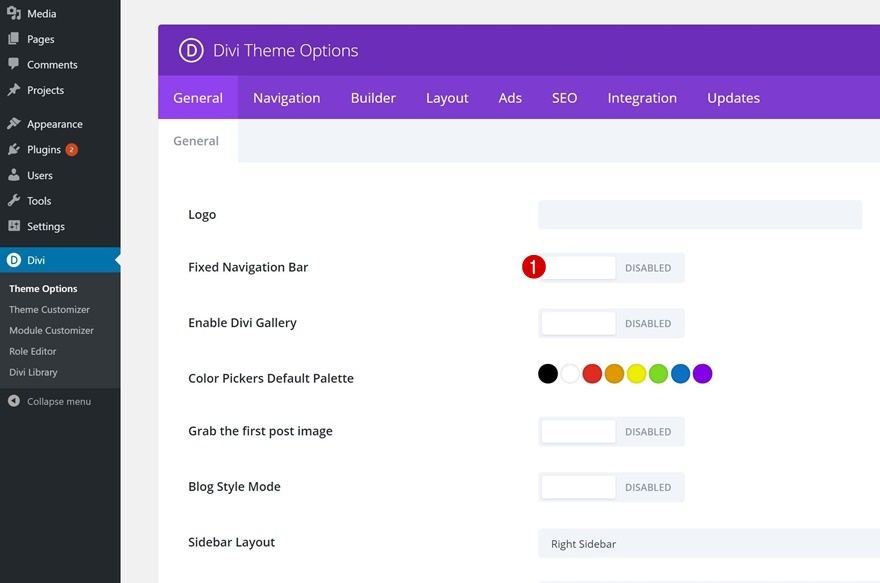 为了确保主菜单栏在设计中保持其位置,我们还需要禁用固定导航栏。 为此,请转到您的WordPress 仪表板 > Divi > 主题选项 > 禁用“固定导航栏”选项并保存设置。