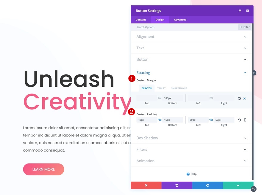 接下来打开间距设置并为您的按钮添加一些边距和填充: