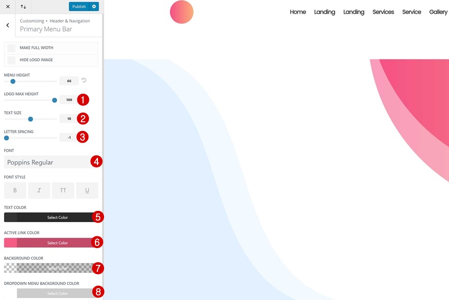 我们还将准备好主菜单栏与我们的 Divi 设计合并。 为此,我们需要先修改主菜单栏设置。 转到标题和导航 > 主菜单栏并使用以下设置: