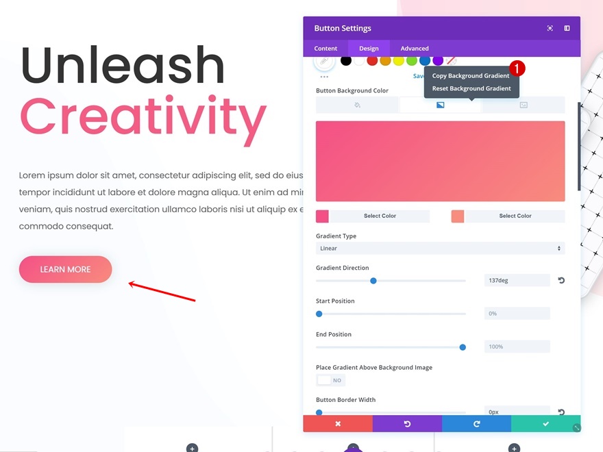 我们将节省一些时间并复制我们已经用于按钮模块的渐变。 为此,打开按钮模块,转到按钮设置,右键单击渐变背景并复制它。