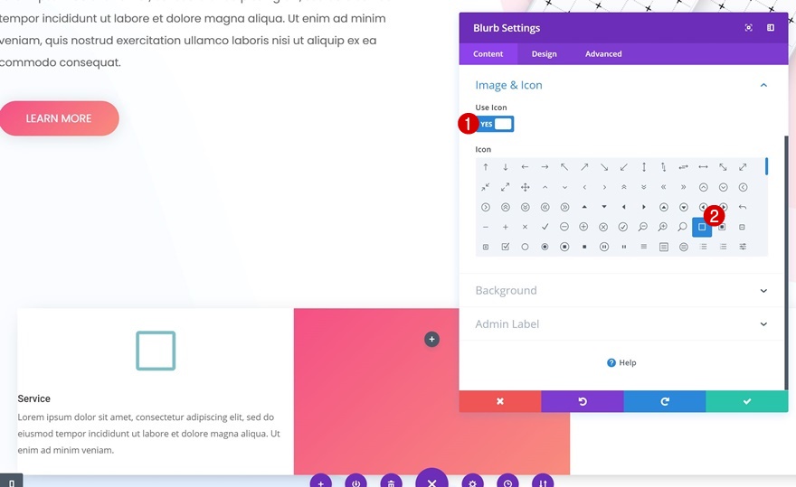 我们总共需要三个 Blurb 模块。 我们将从一个开始,然后克隆它以节省时间。 继续向第一列添加一个新的 Blurb 模块。 添加内容后,选择一个图标。