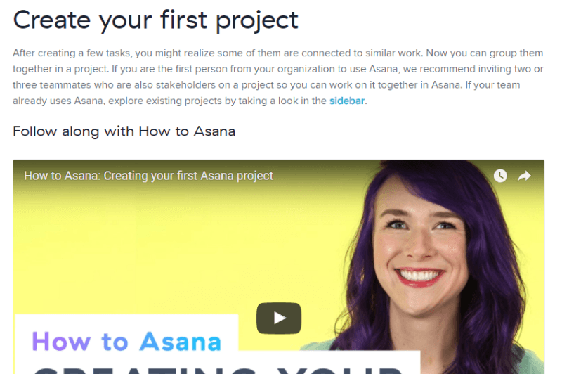 让我们从头开始。 在每篇文章的顶部,Asana 都包含文章的快速视频摘要——这是接触那些喜欢多媒体学习而不是文本的人的好方法:
