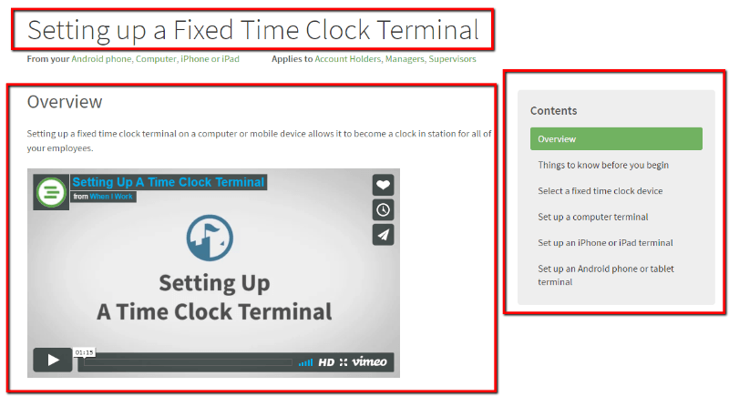 When I Work 是另一个很好的知识库示例,它达到了所有的高点。 在文章的顶部,它们具有一个简短、易于搜索的标题以及一个快速的视频摘要和目录:
