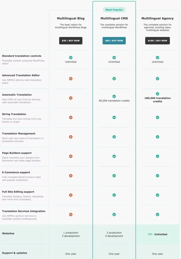如果您的预算不受限制,您可能不会关心价格。 但对于大多数人来说,在进行 WPML 与 Polylang 比较时,每个插件的成本将是另一个重要因素。