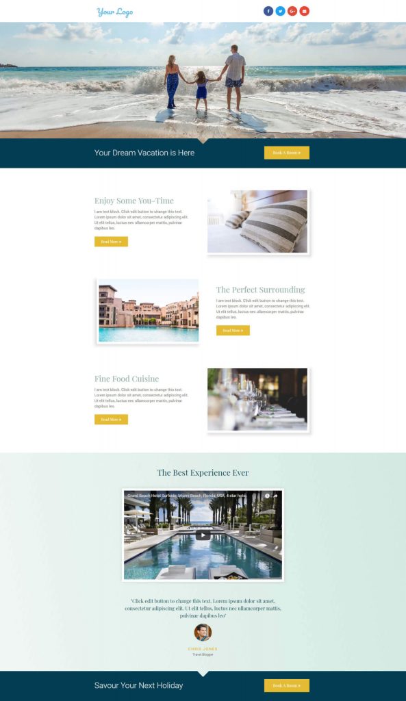 您可以在页面顶部添加您的徽标和社交链接,然后添加全宽横幅图片来介绍您的酒店。 您可以使用横幅图片下方的 CTA 按钮从您的客户那里接受预订订单。