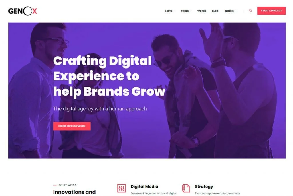 Genox 是一个漂亮的多用途模板,适用于创意数字网络机构。 该模板的创建者通过 5 个不同的主页演示和无数独特的设计变化进行了多种投资。 您还将获得完整网站所需的所有块和部分。