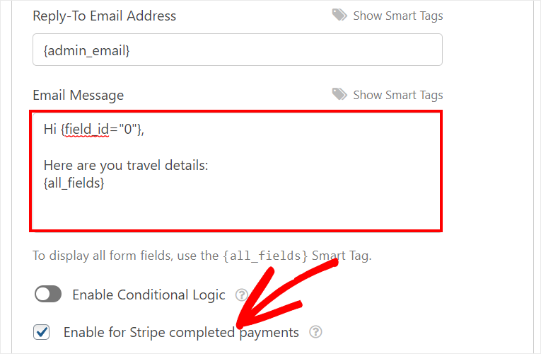 您还将看到启用条件逻辑的选项。 这允许您仅在满足某些条件时发送电子邮件。 使用此选项,您可以创建单独的通知或确认电子邮件,这些电子邮件将发送给预订不同行程的客户。