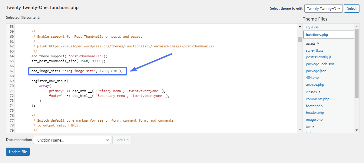 将 image-size-name 替换为您在前面步骤中使用的图像尺寸的名称。 在我们的例子中,图像大小的名称是 blog-image-size。 所以我们的代码将如下所示: