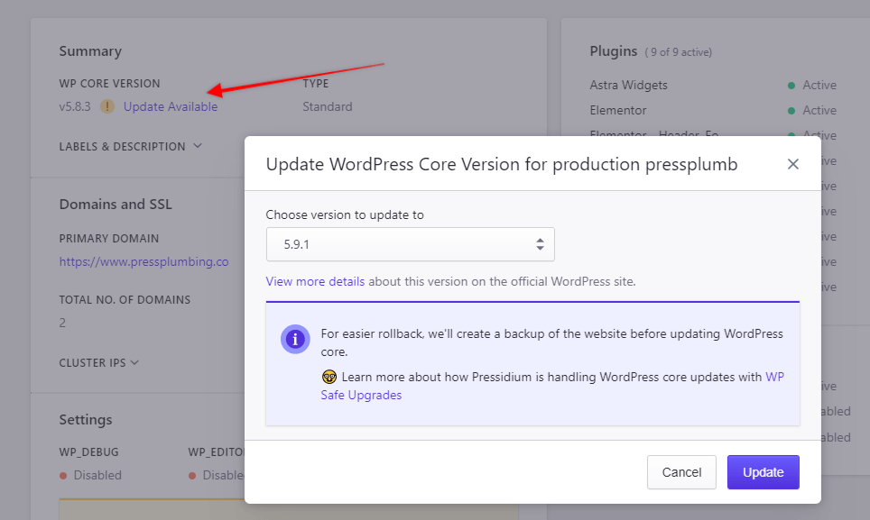 如上所述,5.9 尤其受到影响,在最初的次要版本发布时修复了 85 个错误。 我们认为稳定性和可靠性比即时访问最新和最强大的功能更重要,因此在正式发布主要 WordPress 更新和我们将其推广给客户之间存在延迟。 但是,如果您想提前升级,可以从仪表板轻松完成。