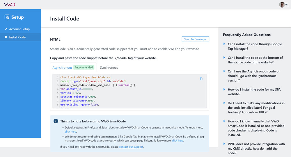 您可以在右上角的 Visual Web Optimizer 仪表板上找到它。 它只是一个六位数的数字。 在 WordPress 设置中输入 ID,保存,插件将处理其余部分。