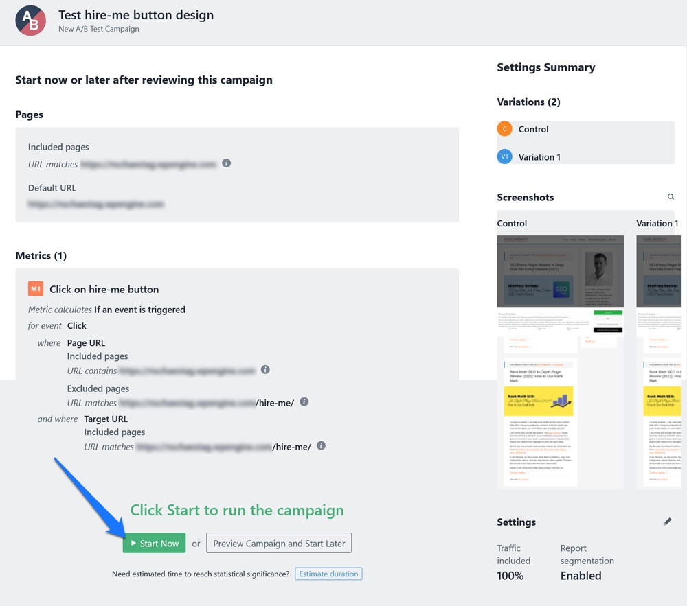 做出决定后,单击“创建”以进入摘要页面。 检查一切是否如您所愿,然后点击底部的Start Now按钮开始运行测试。