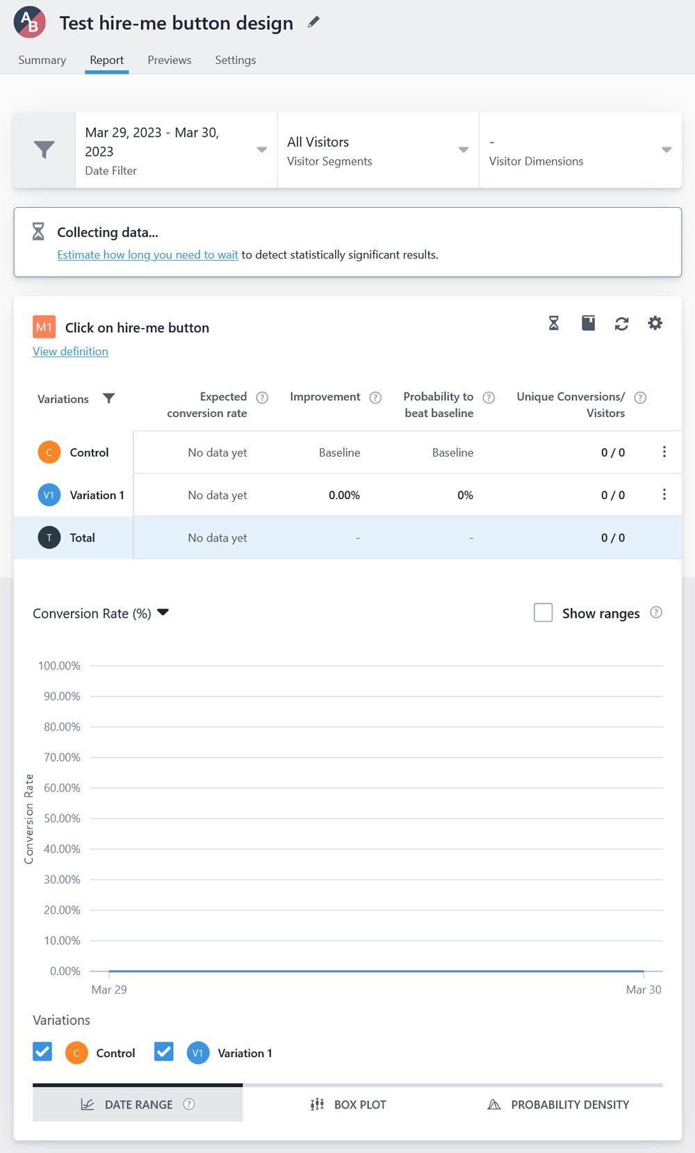 您可以使用内置的分析工具来跟踪每个变体的点击率、转化率和跳出率等指标。 它还带有 20 多个不同的预定义段,您可以使用它们来进一步分解测试结果。 这些包括一天中的时间、浏览器、位置以及新访客和回访者。
