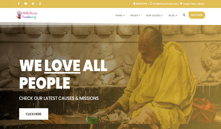 主题主页包括几个部分,包括社区、捐赠、关于、博客、赞助商和一个漂亮的滑块。 此外,该主题中包含的社交媒体图标有助于通过各种社交平台宣传您的事业。