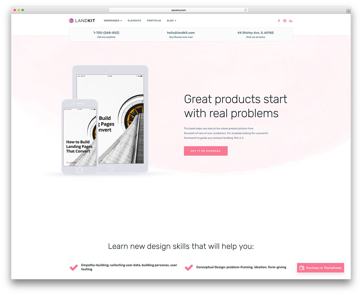 Landkit 最特别的交易之一是其下拉菜单,其中包含 100 个强大的元素。 从 12 个页眉、3 个页脚中进行选择,并自定义每个视觉方面。 您还将获得 SEO 性能、动画和图像/视频背景。 设置视差效果页面,启用其顶部栏并使用社交媒体共享按钮进行播放。 Landkit 为图标和字体、投资组合和博客页面提供了漂亮的选项。 它是一个视觉美学的主题思想和一个精心呈现的形象。 它适用于非常适合企业的客户-卖方互动。 从 10 种不同的手工制作选项中查看其专门的电子书演示! 看看Landkit!