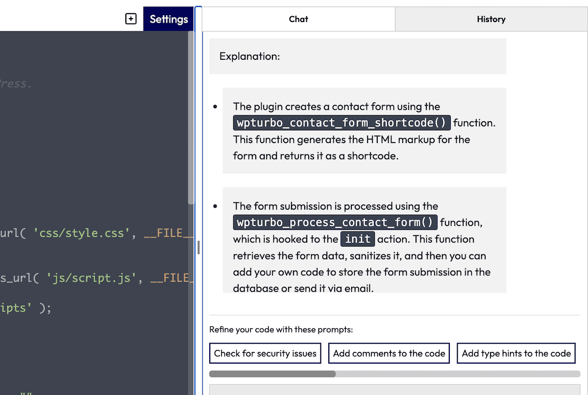 虽然代码生成器对于常规“管理”类型的开发任务来说近乎完美,但 WPTurbo AI 才是真正的肉和土豆。 这会在右侧显示一个代码编辑器窗口和一个聊天框。