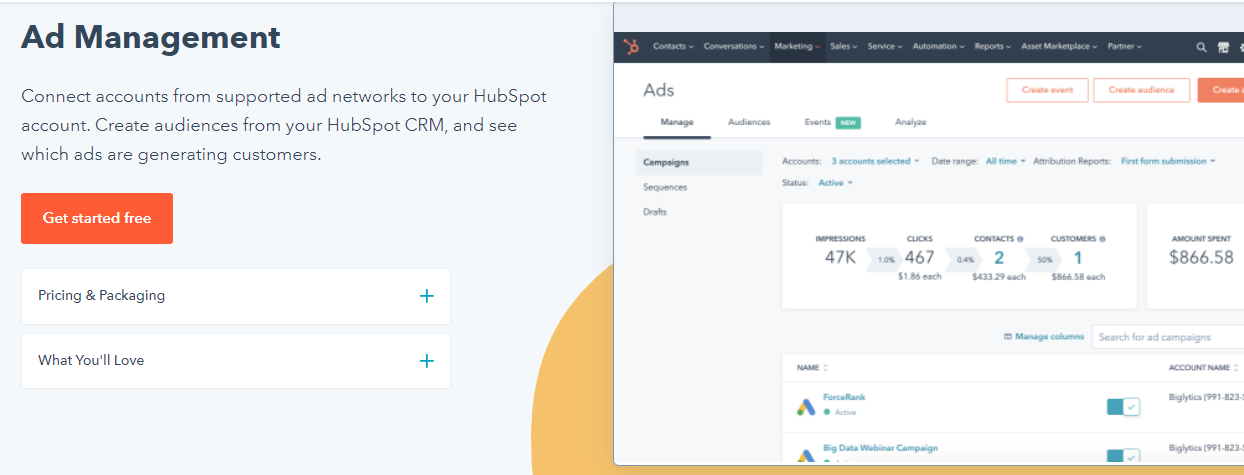 除了營銷和銷售中心之外,HubSpot 廣告管理軟件還可以與其他營銷平台集成。 營銷活動的衡量標準是投資回報率 (ROI) 和他們帶來的新客戶數量。借助 HubSpot CRM 集成,您可以針對特定受眾成員投放廣告。 這還不是全部:動態廣告可能是個性化的,以保證它們具有高度針對性。 想要使用此軟件改進營銷活動的營銷人員會得到很好的幫助。 該計劃使多活動管理變得輕而易舉。
