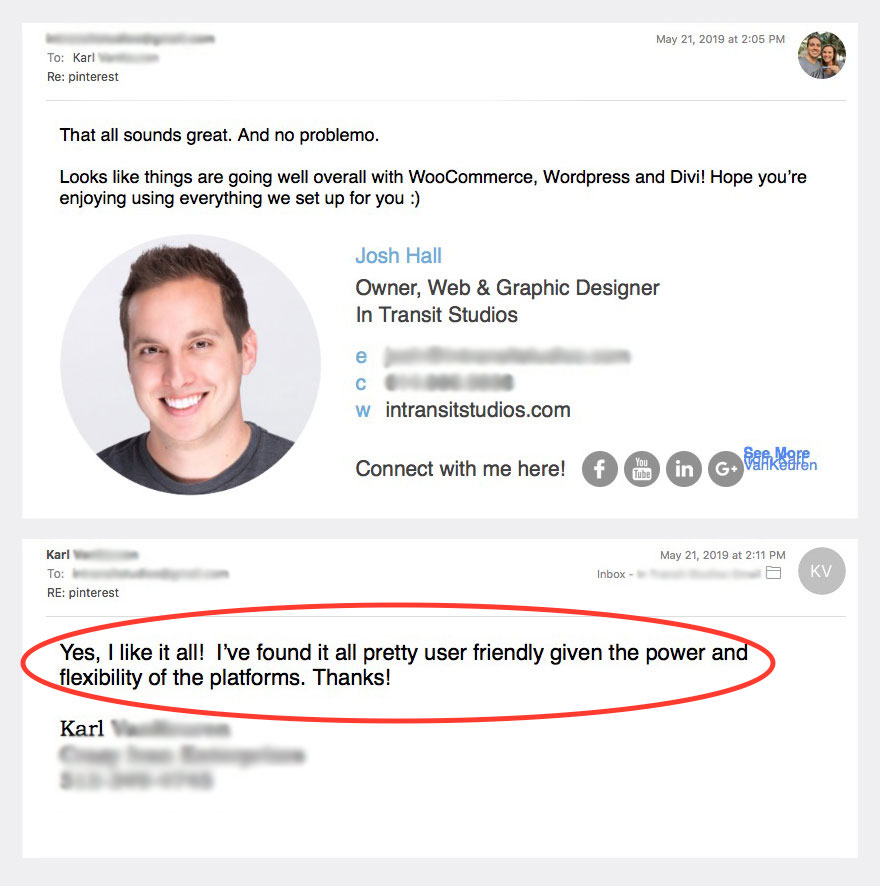 即使在今天,我所擁有的培訓系統和資源仍在繼續為我的客戶提供支持。 這是我的一位客戶最近發送的一封電子郵件,他喜歡 Divi 和我們用來構建他的網站的其他工具: