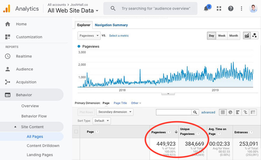 從我發布 8/16/17 到 5/30/19 的實時分析和頁面瀏覽量