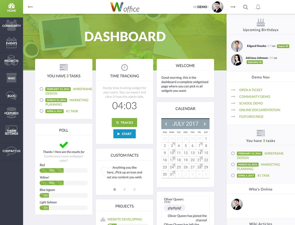 Woffice 主題的眾多功能之一是它能夠幫助您在線管理項目、將事件添加到日曆系統以及在內部 wiki 上發佈內容。 由於 Woffice 具有您對最佳 Intranet WordPress 主題之一所期望的所有社區功能,因此可以輕鬆支持多個用戶帳戶、為您的用戶創建交流空間以及自行管理他們的帳戶。 Woffice 的社區功能由久經考驗的 bbPress 和 BuddyPress 插件提供支持,這兩個可擴展工具可以將 WordPress 轉變為社交網絡風格的門戶。