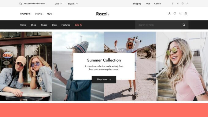 大多數時尚主題在設計時都考慮到了服裝。 如果您在商店中銷售鞋子、手錶和配飾,像 Razzi 這樣的多功能主題可能是您的正確選擇。
