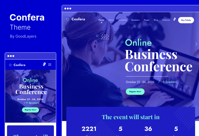 Confera 是組織在線或離線會議的理想平台。 其清晰的首頁和內部頁面設計使會議組織者能夠專注於宣傳。
