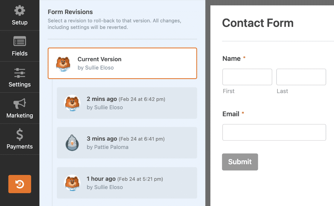 WPForms 允許您使用表單修訂功能輕鬆完成此操作。 這意味著如果您正在測試表單或臨時修改表單,您無需擔心。