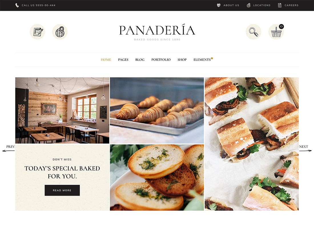 Panaderia 主題在主頁上具有令人驚嘆的畫廊佈局,可以輕鬆展示您最受歡迎的菜餚或烘焙食品。