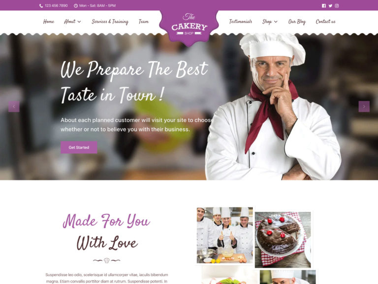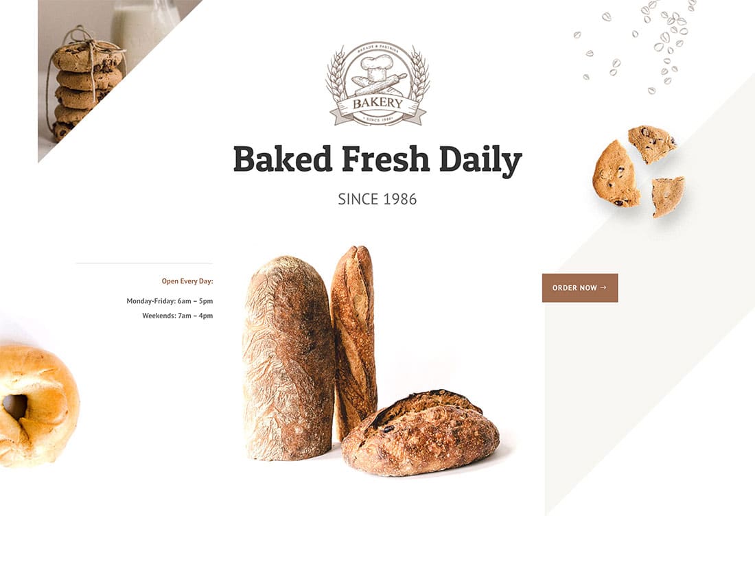 主頁有一個令人驚嘆的滑塊,您可以使用它來創建暢銷商品的幻燈片或分享您的食譜。 您可以輕鬆邀請訪客閱讀有關您的麵包店的更多信息、探索您的特色菜或查看配料列表。 共享有關您的員工的信息以建立信任並與您的受眾建立聯繫,並且不要忘記包括重要信息,例如您的位置和營業時間。