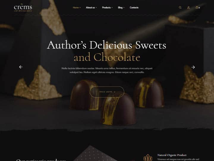 無論您是生產烘焙食品、糕點、糖果還是巧克力,Crems 都應該適合您的網站。 有多個主頁可供選擇,涵蓋了幾種不同的網頁設計風格。 主頁模板已針對您可能在麵包店提供的各種類型的物品進行了優化,並且可以根據您的業務輕鬆調整。