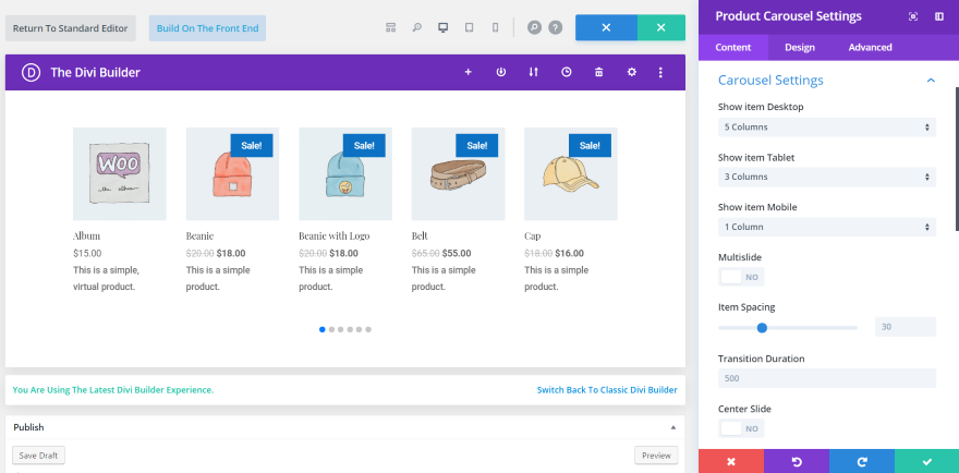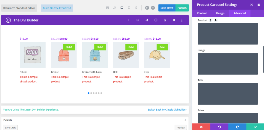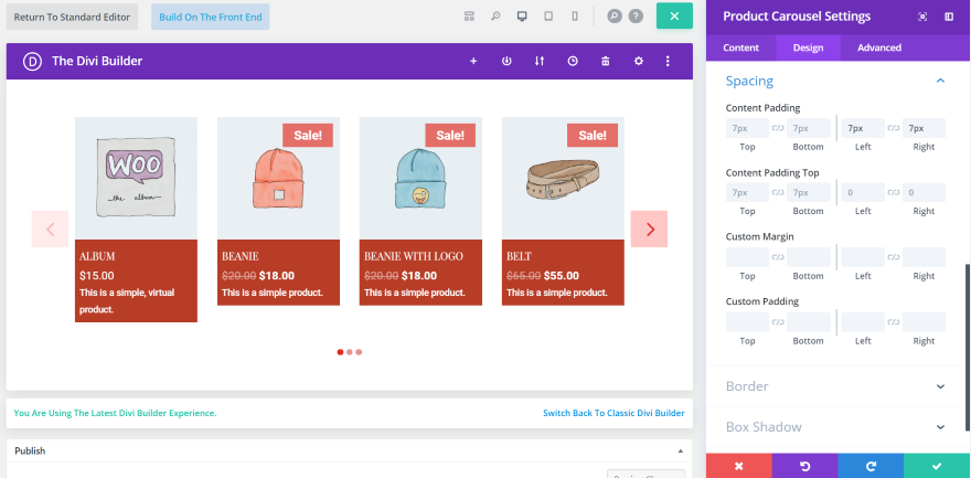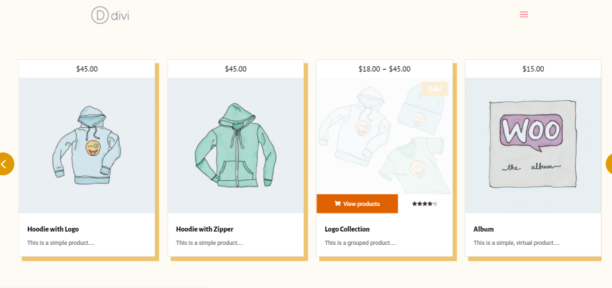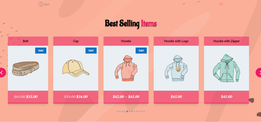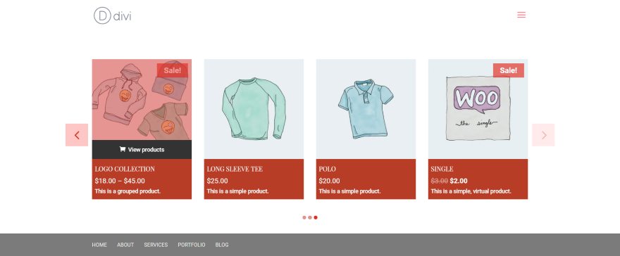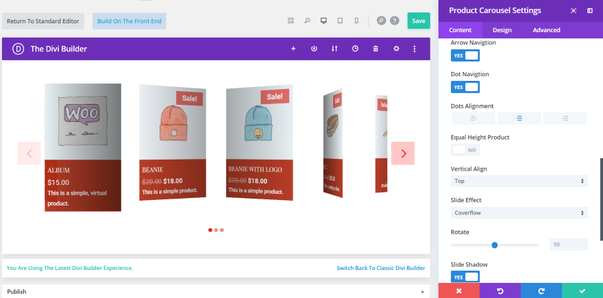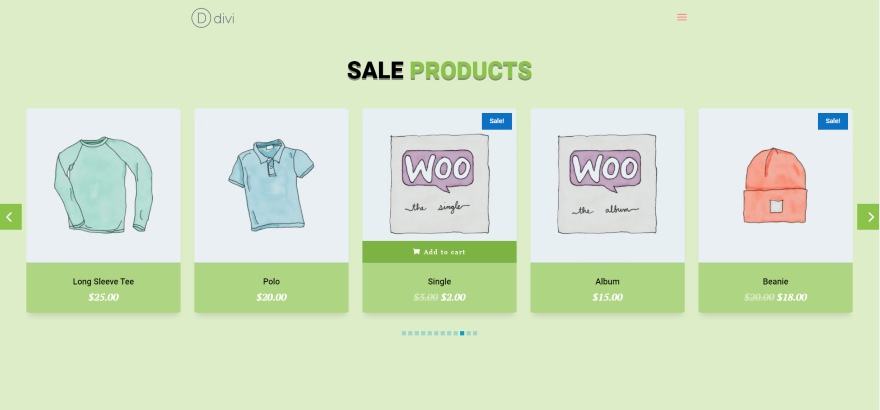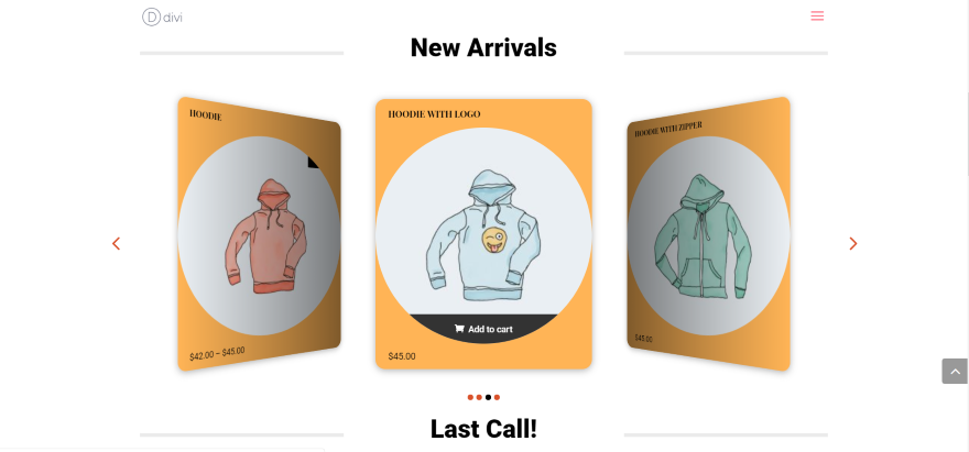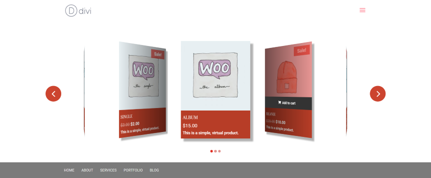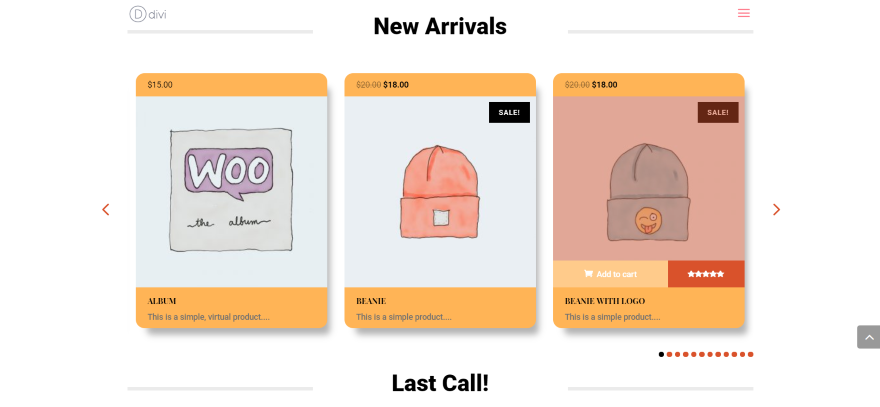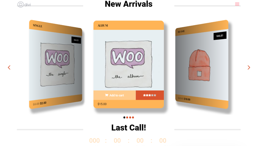 Divi Product Carousel 易於使用,非常適合讓您的產品脫穎而出。 即使您不想將它們顯示為滑塊,它也有很多樣式和產品展示選項值得考慮。 我在 Extra 上工作得不是很好。 我很想看到 Extra 支持,因為它已經有很多 WooCommerce 功能,並且是構建 WooCommerce 商店的絕佳平台。