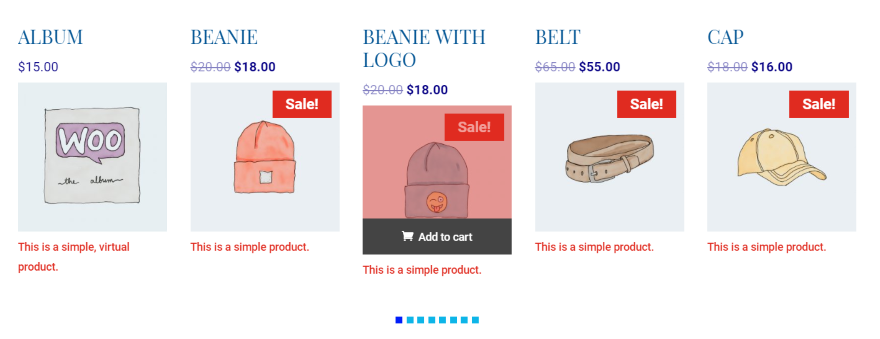 這是它在前端的外觀。 我還添加了一個疊加層,懸停時會出現“添加到購物車”按鈕。 您可以為疊加懸停和按鈕懸停設置此按鈕的樣式。