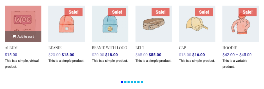您可以將標題和價格移至頂部或底部。 在本例中,我將兩者都移到了頂部並更改了它們的大小和顏色。 我通過更改背景顏色和字體大小來設計銷售徽章的樣式。 我還設計了非活動和活動點的樣式。